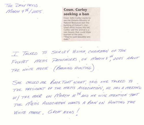 There was a radio interview today in Timmins with Mr. John Curly, counsellor for the City of Timmins and it was mainly about protecting the white moose. It scared quite a few residents and I received phone calls after phone calls on the matter. They fear that Timmins is trying to get the white moose at Cedar Meadows and we'll lose our chance to better our community and boost its economy. Let me tell you what I've said. I told them not to panic that we had talked and you were willing to look at other options to save them. Some were even talking about calling him and so on but I discouraged them from doing so because who knows what will happen - I don't want to burn our bridges. I said that depending on what his intentions are, this might be exactly what we need to get the MNR motivated and told them that I would contact him to discuss the matter. I didn't get a hold of him so I will try again tomorrow.